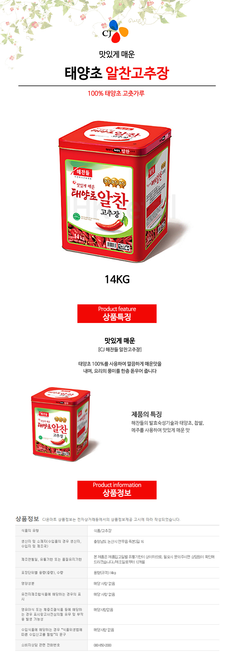 [CJ제일제당] 해찬들 맛있게 매운 태양초 알찬 고추장 14kg