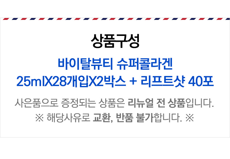 | 섭취 시 주의사항 및 부작용 발생 가능성 | 섭취량 : 성인 1일 1회, 1회 1앰플(25ml) / 섭취방법 : 흔들어 섭취하세요. 매일 저녁 시간 섭취하시면 좋습니다. / 섭취시 주의사항 : 용기 개봉 시 손이 다치지 않도록 뚜껑 부위를 조심스럽게 잡고 여시기 바랍니다. 캡 고리 부분을 삼키지 않도록 주의하시기 바랍니다. 제품에 열을 가하거나 얼리지 않도록 주의해 주시기 바랍니다. 식품 원료의 특징상 거품이나 침전물이 생길 수 있으며, 보관 방법에 따라 내용물의 색상 편차가 있을 수 있으나 콜라겐 원료의 특성상 발생할 수 있는 현상으로 안심하고 충분히 흔들어 섭취하셔도 좋습니다. 용기가 변형되거나 훼손되어 내용물의 맛, 향이 변한 경우에는 섭취하지 않도록 해 주시기 바랍니다. |